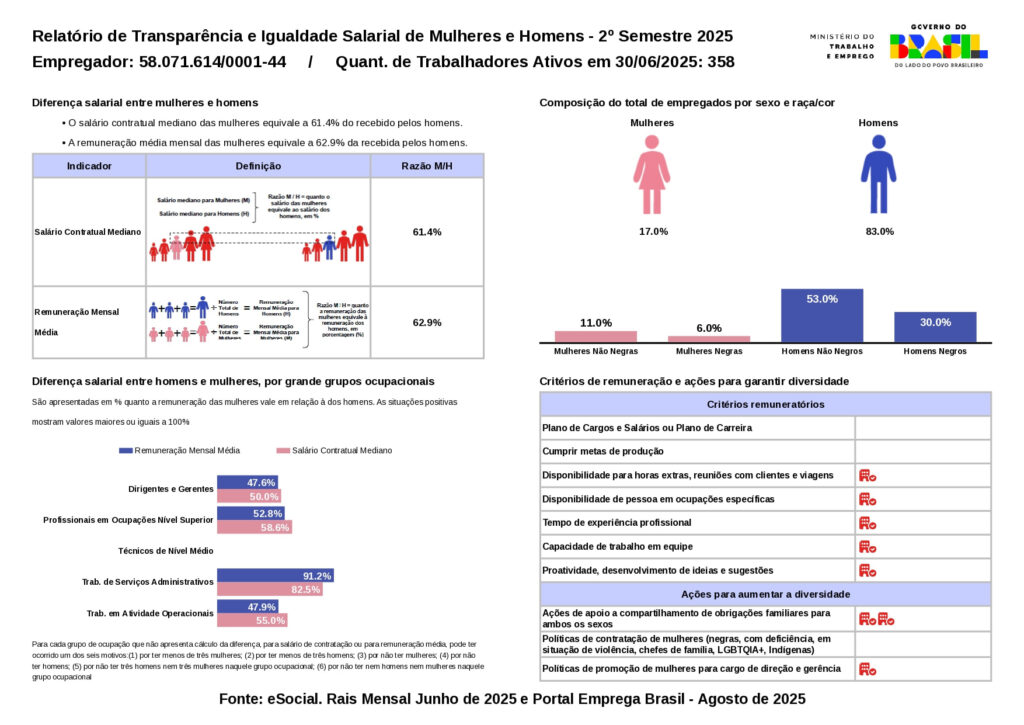Em conformidade com a legislação em vigor e com o nosso compromisso de promover um ambiente de trabalho justo e inclusivo, disponibilizamos o Relatório de Transparência e Igualdade Salarial entre Mulheres e Homens.